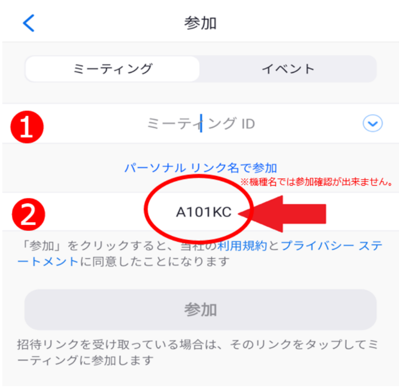 ※スマートフォンでのご参加は、お名前の欄に機種名(右記の画像例では:「A101KC」)が表示されていることがあります。 お手数ですが、この機種名を削除して、参加番号を入力してください。